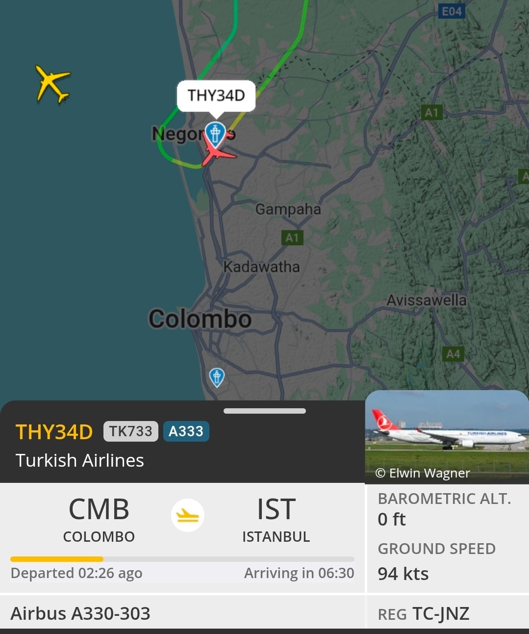 TK-733 என்ற துருக்கிய ஏர்லைன்ஸ் விமானம் 202 பயணிகள் மற்றும் 10 பணியாளர்களுடன் 16 ஆம் திகதி செவ்வாய்க்கிழமை இரவு 10.00 மணிக்கு கட்டுநாயக்க விமான நிலையத்திலிருந்து துருக்கியின் இஸ்தான்புல்லுக்குப் புறப்பட்டது.