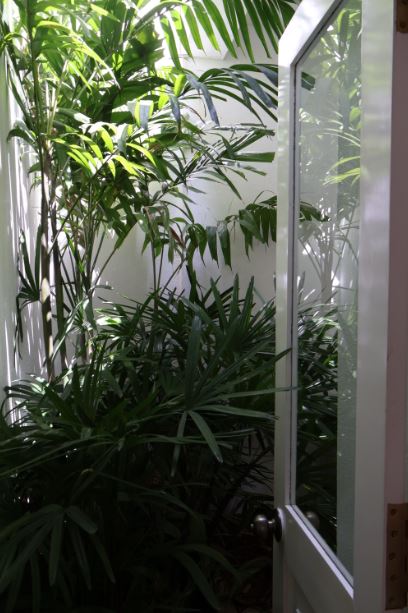 From the open plan living and dining areas, guests are led down a handful of steps into the sunken bedroom where cool terracotta tiles line the sunken floor. The experience of descending into the bedroom gives the room a cool seclusion and the impression that the ceiling is soaring above the wide bed. As with the living and dining areas, the bedroom hosts its own courtyard garden, pulling in natural light and showcasing the play of shadow amongst green vegetation. This tight control of space and vista is classic Bawa, and reminiscent of many of his properties, including his Lunuganga house and garden.